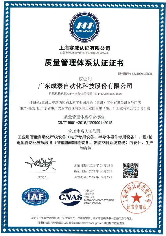 廣東成泰自動(dòng)化科技股份有限公司成立于2016年,深耕新能源、PCB/半導(dǎo)體智能裝備領(lǐng)域。是一家在高端裝備領(lǐng)域集設(shè)計(jì)、研發(fā)、生產(chǎn)、銷(xiāo)售和服務(wù)為一體的國(guó)家級(jí)高新技術(shù)企業(yè)、國(guó)家級(jí)知識(shí)產(chǎn)權(quán)優(yōu)勢(shì)企業(yè)、國(guó)家級(jí)專(zhuān)精特新“小巨人”企業(yè)。目前擁有自主知識(shí)產(chǎn)權(quán)近500項(xiàng),擁有80余人的核心研發(fā)團(tuán)隊(duì)和400余人的生產(chǎn)制造團(tuán)隊(duì)。